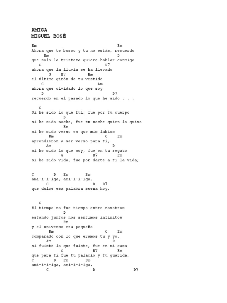 Amiga Miguel Bose Acordes : El tiempo no fue tiempo entre nosotros estando juntos nos sentimos infinitos y el universo era pequeño comparado con lo que éramos tu y yo si fuiste lo que fuiste fue en mi casa que para tí fue tu palacio y tu guarida amiga.