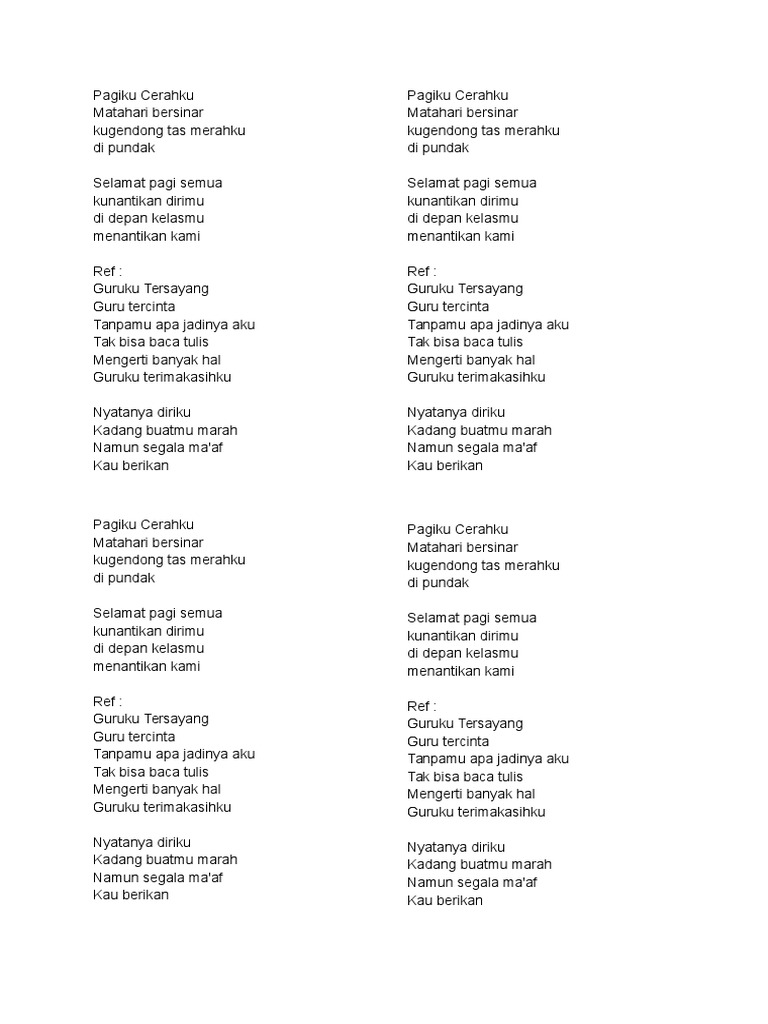 Guruku Tersayang Lirik Cute766 Pilih satu link dari 15 daftar dibawah untuk streaming video klip mp4 di metro musik, detail informasi dan kumpulan full kumpulan tiktok pagiku cerahku matahari bersinar, kugendong tas merahku dipundak.