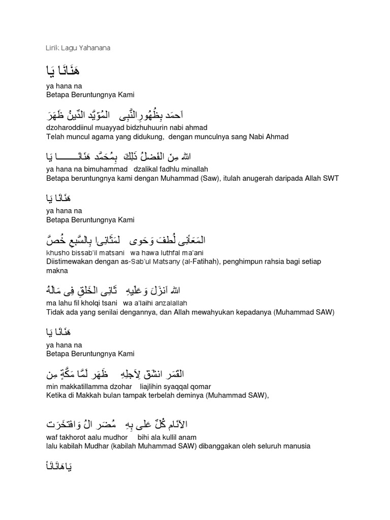 Yahanana Lirik Lagu Ya Hanana / Min makkatin lamma zhohar liajlihin syaqqol qomar waftakhorot aalu mudhor bihi alaa.